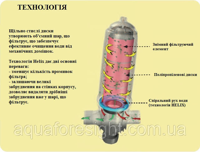 У дисковому фільтрі Azud застосовується технологія Helix System (HS) - це запатентований метод спірального розподілу води, що обробляється, по поверхні фільтруючого елемента, що значно збільшує фільтроцикл системи і мінімізує кількість промивок фільтра.